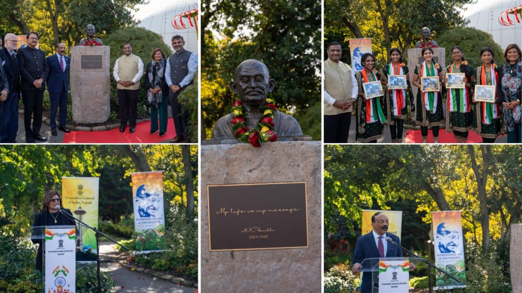 • Another function took place in the afternoon at the Seattle Center near the base of the Space Needle. Washington State Senator Vandana Slatter offered floral tributes at the bust of Mahatma Gandhi. She was joined by Eddie Rye, Chairman and Founder of the Martin Luther King (MLK) – Gandhi Foundation.